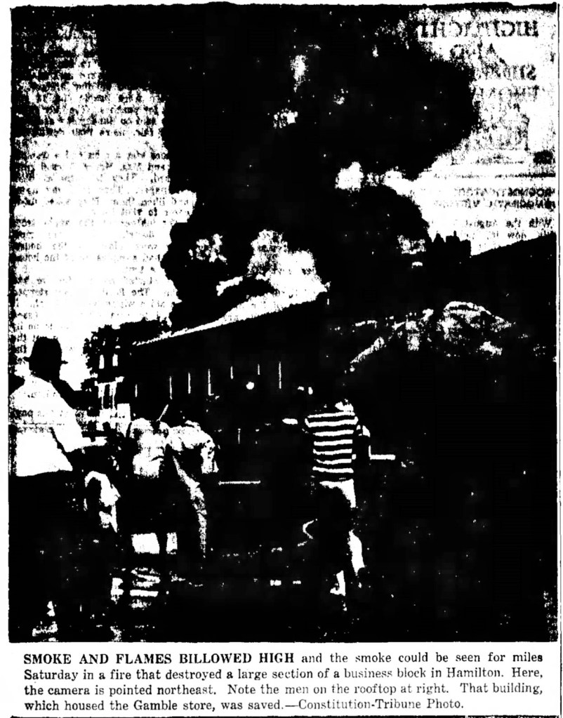 An Aug. 13, 1966 blaze threatened an entire block at the north end of Davis Street in downtown Hamilton, destroying two business buildings.