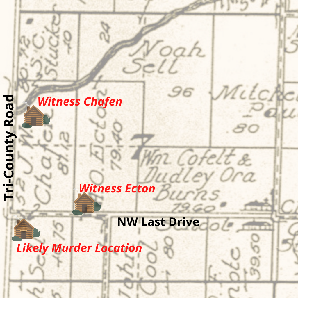 During the trial, Asa Ecton, who lived a quarter of a mile from the Filley house offered chilling testimony that corroborated events as reported by J. W. Chaffin. He said he had a clear view of the Filley barn, and on the day of her “accident” he saw Mr. and Mrs. Filley enter the barn together with two horses. He then saw Filley “strike something inside the barn with a stick” while standing in the barn doorway. Ecton said that while this was happening, he heard a woman’s voice say, “Oh, don’t!” and immediately thereafter watched as Filley walked out of the doorway, latched the barn doors, and turned toward the house. Half an hour later, he observed Filley walking in the direction of the J. W. Chaffin home.