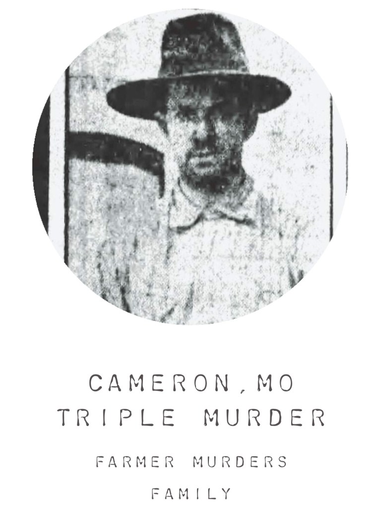 Triple murder at Tri-County Road and NW Last Drive, just SE of Cameron, Mo results in only public hanging carried out in Caldwell County. The motive remains a mystery, but theories ranged from an illicit love triangle to the madness from a sore finger.